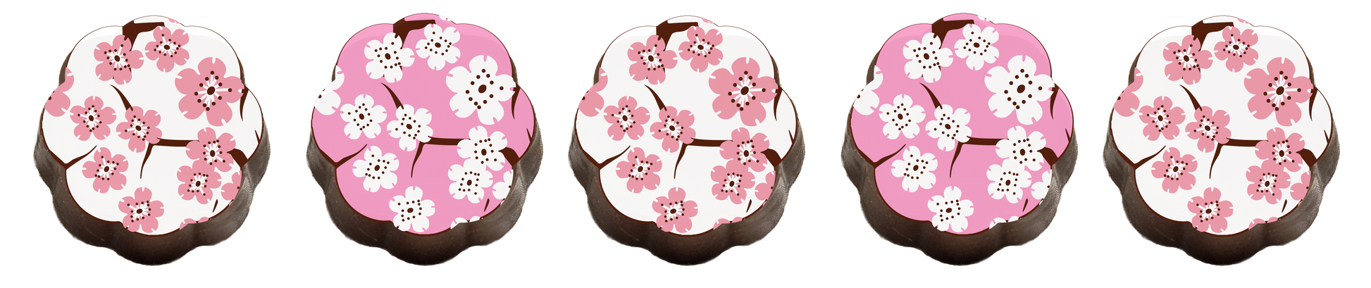 White Background Pink Blossoms - Perfect Vanilla Bean Caramel with Fleur de Sel crystals sprinkled inside a dark chocolate shell. Pink Background White Blossoms -Perfect Vanilla Bean Caramel with Fleur de Sel crystals sprinkled inside a milk chocolate shell.