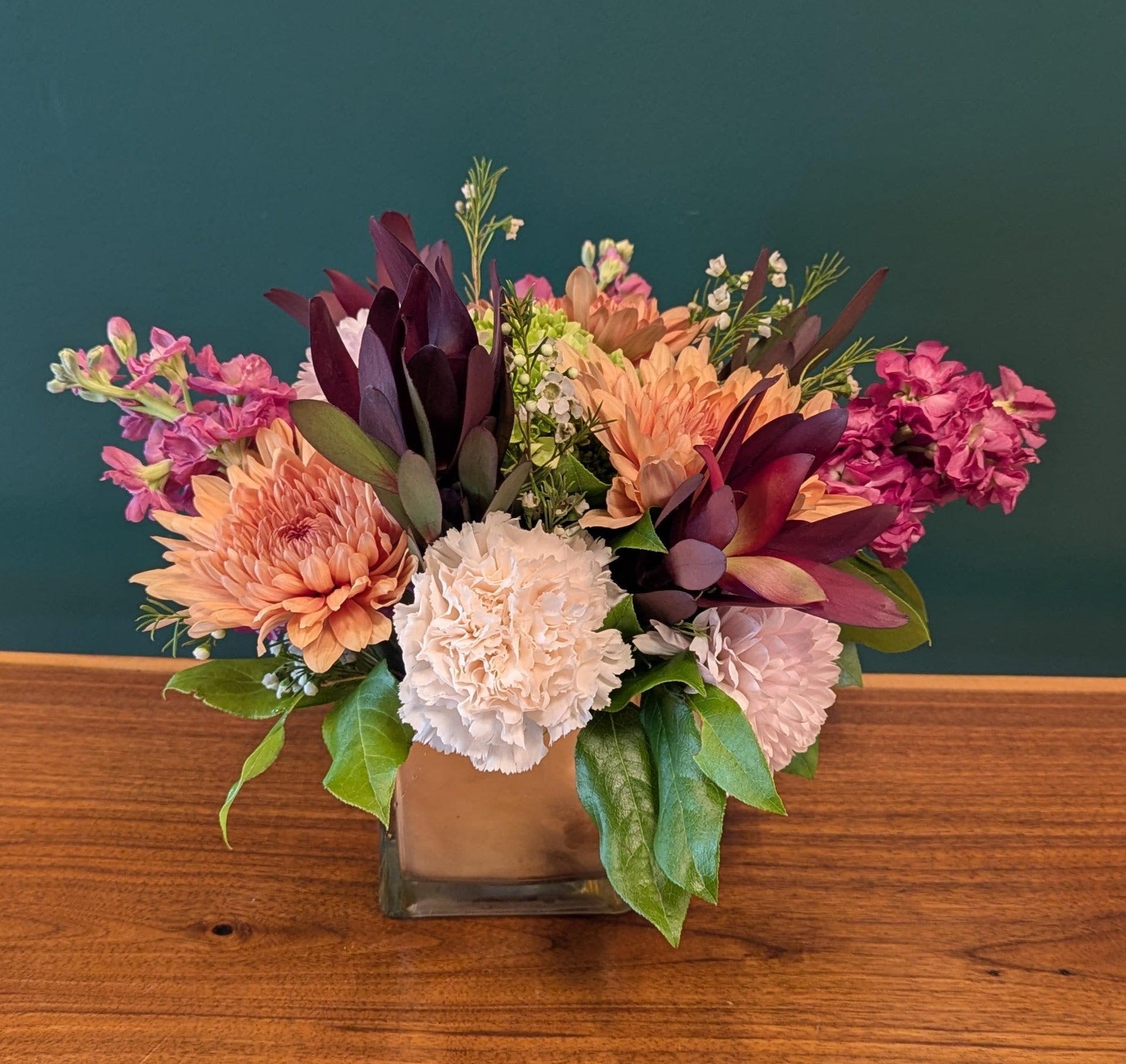 This arrangement features some of nature's more neutral flower colors; white, green, beige or peach. Flower varieties in this arrangement may include Chrysanthemums, Hydrangeas, Carnations, Daisies, and Alstroemeria. Our talented designers create unique arrangements that change daily based on the freshest blooms available. Keep in mind that specific flower types and vases are subject to your selected budget.